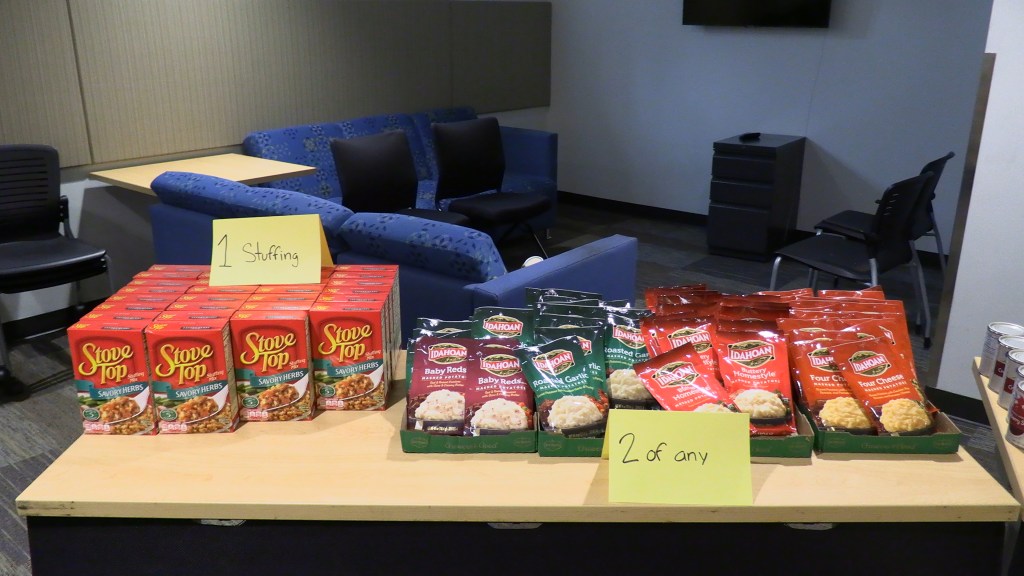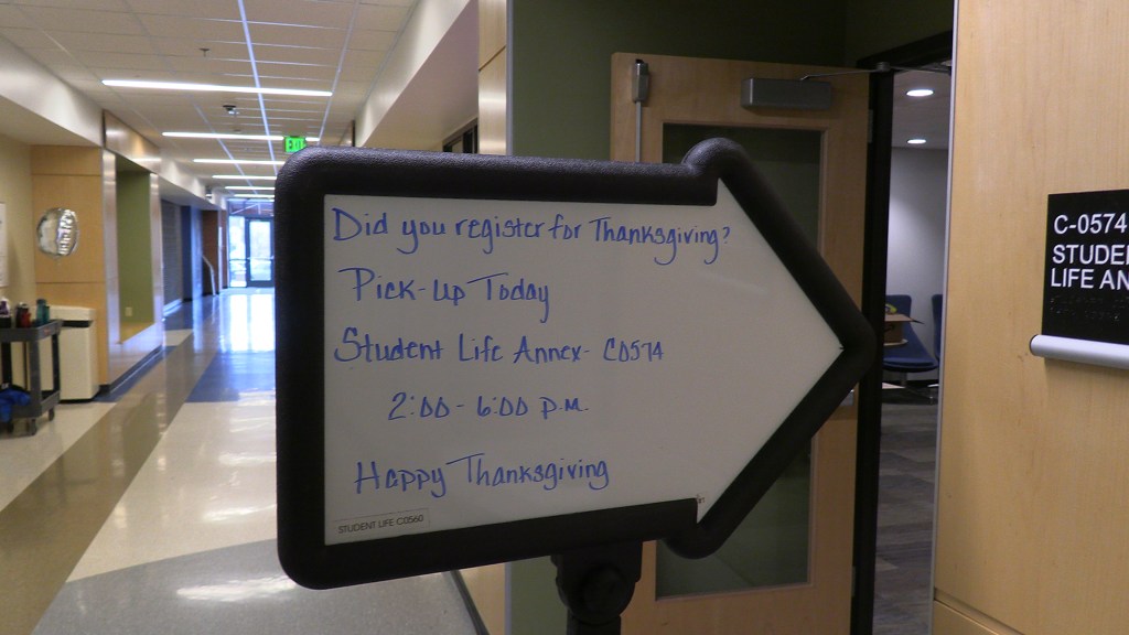 To those in need, Student Life provided people within the Food Pantry who signed up for the occasion Thanksgiving meals on Friday, November 21st. Those who showed up received a turkey, pumpkin pie, box of stuffing, can of cranberry sauce, 2 cans of green beans and/or corn, and any 2 packets of instant mashed potatoes.