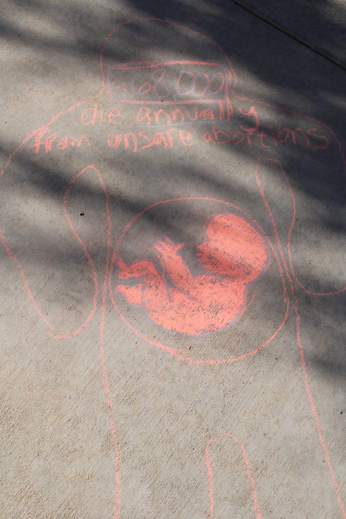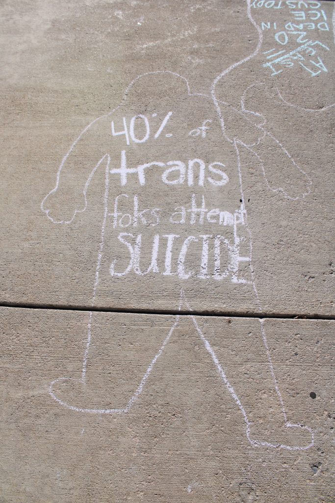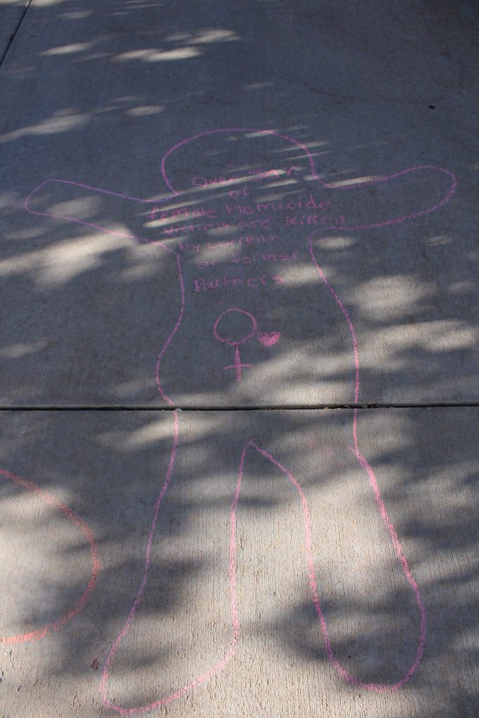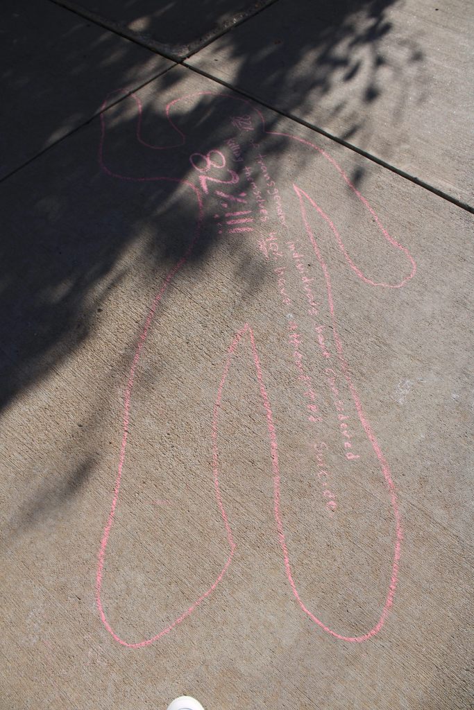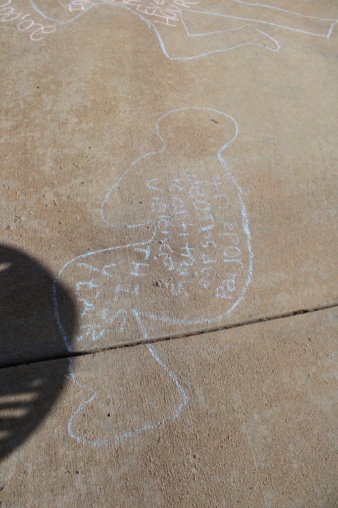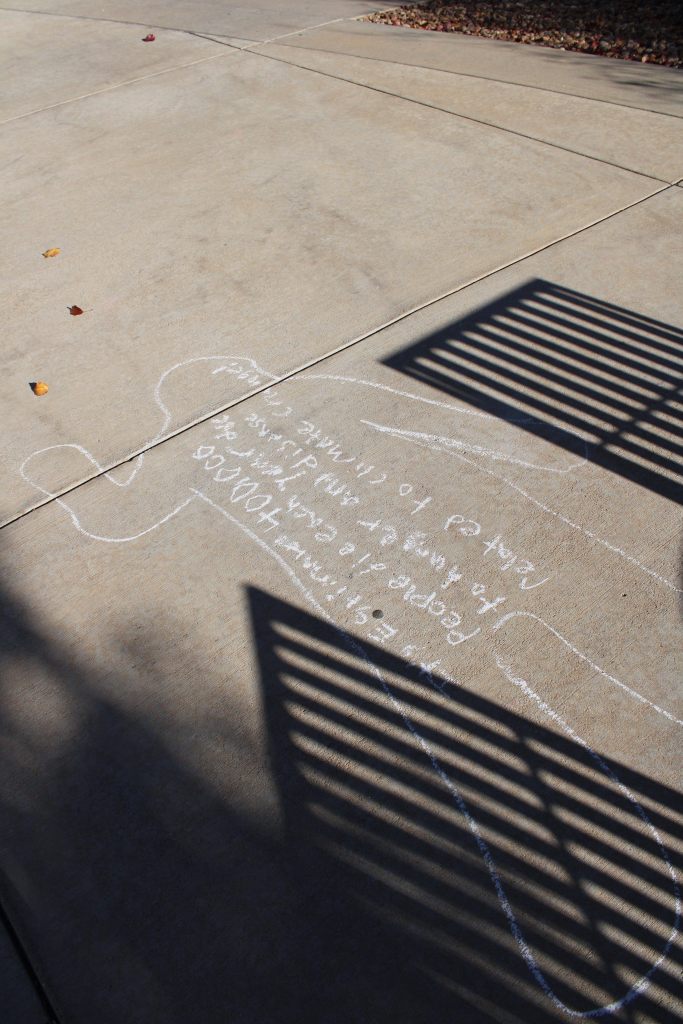 Dr. Kristina Kahl’s Death and Dying class hosted a Die-in on November 13th outside the WC Welcome Center. Rather than the class laying on the ground outside, chalk outlines depicting positions of corpses – with facts about death statistics relating to various social issues written inside the outline – were drawn instead.