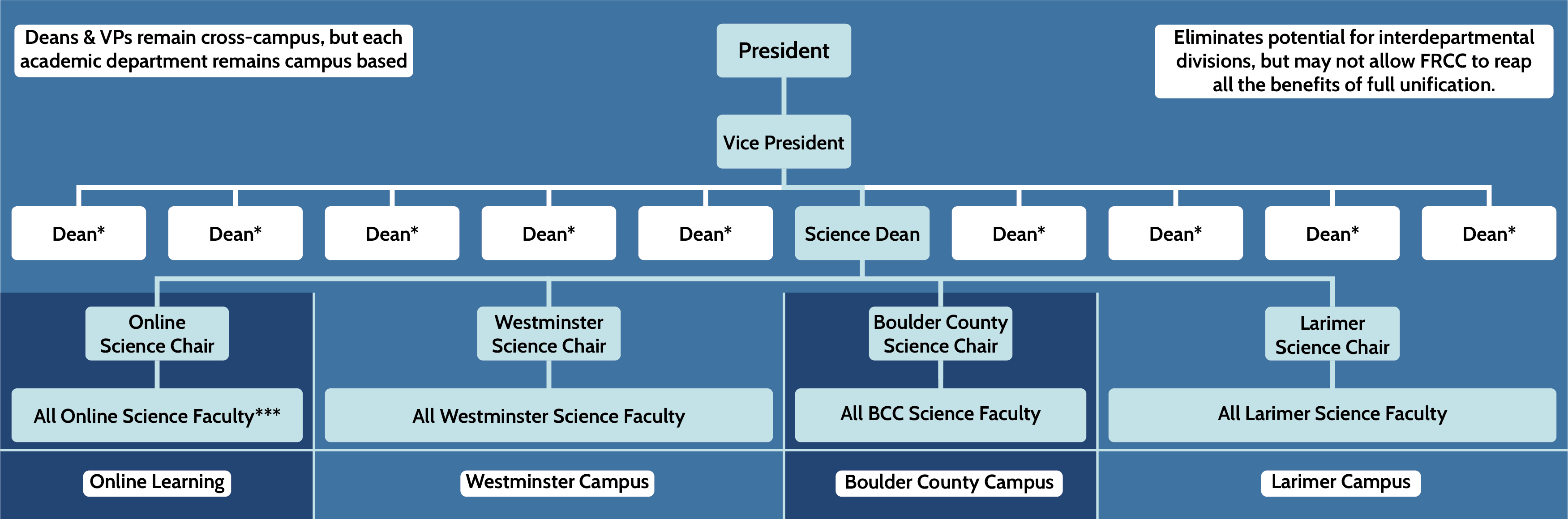 Right now, FRCC has one president, four vice presidents, and each campus, including online, has deans that answer to those vice presidents, and department chairs that answer to those deans. Department chairs are the ones who deal with faculty and students directly, also often teaching courses themselves.