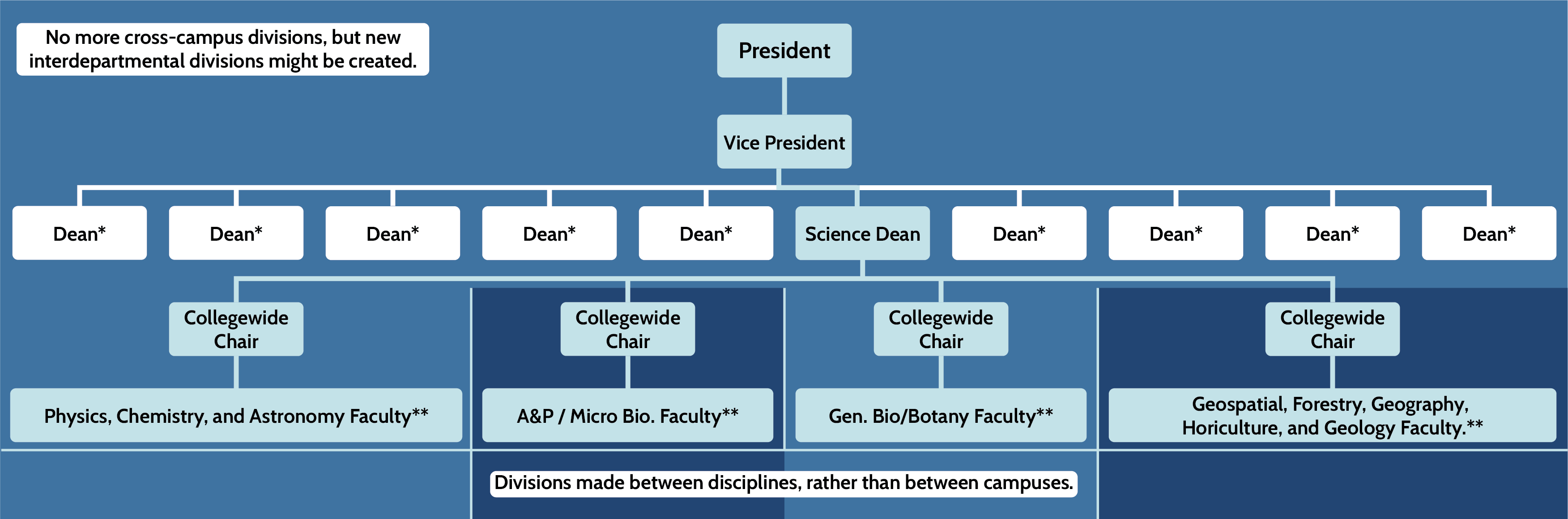 The restructuring doesn’t stop at the level of deans, either. The current plan is also to expand entire departments across the college, including the creation of college-wide chairs. Of course, you can’t just combine three departments across the three campuses and online, no chair could ever be reasonably expected to oversee that many faculty. The plan to deal with this is similar to what was done with the deans and vice presidents: division across disciplinary lines. As an example, after the restructuring, there will no longer be four Science departments for the four different campuses. Instead, there will be one Science dean, and four Science chairs, with faculty divided between the chairs based on their discipline.